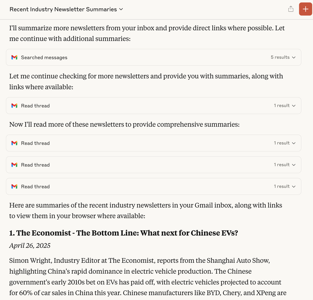 A big problem was the scope and precision of processing. For example, Claude with an MCP connector to Gmail was able to summarize newsletters in my inbox very nicely, but it stopped every time after newsletter no. 10 or so, while the pre-programmed workflow can process any number of inputs. Somehow the agent seems to have a limit in the length of its processing run. Similarly, the competitor analysis always stopped at a small number of relevant companies (often less than a third of what the workflow AI was finding), and the agents struggled to find correct numerical data, such as fundraising information. In some cases, the agents ended up hallucinating wildly.